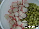 Нарезать крабовые палочки кольцами, приготовить горошек.