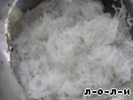 Перемешать горошек, крабовые палочки, фунчезу. Заправить салат острым соевым соусом и горчичным майонезом. Получается вот такое вот блюдо.