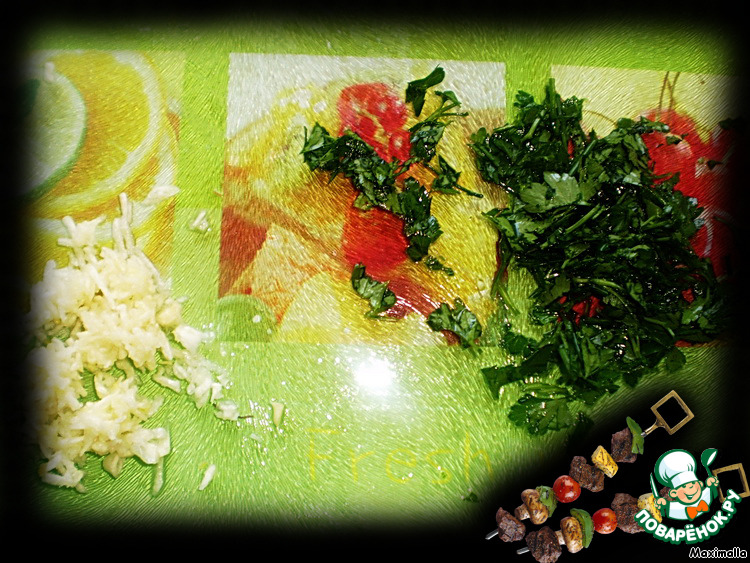 - Сок лимонный (сок 0,5 лимона в куриный маринад, сок 0,5 лимона в овощной) — 1 шт
