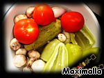 У перчика отрезать хвостик, разрезать пополам, а потом каждую половинку на квадраты приблизительно 4*4 см. Лук нарезать кольцами, кабачки - либо кружочками, либо тоже кубиками 4*4 (это кто как любит, кто любит помягче, то кружочками). Помидор режем на 4 части. Грибы не резать.