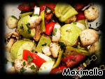 Остальные овощи поливаем растительным маслом, соком лимона, солим, перчим, присыпаем петрушкой, измельченным чесноком, майораном, базиликом. Перемешиваем аккуратно. Тоже ставим в холодильник на такое же время, как и курицу.