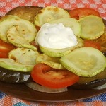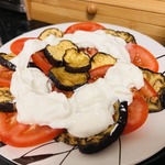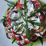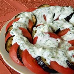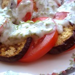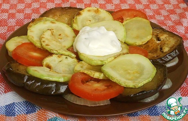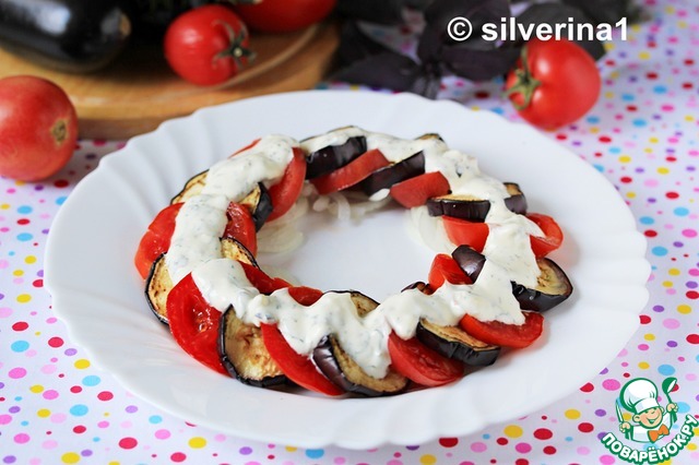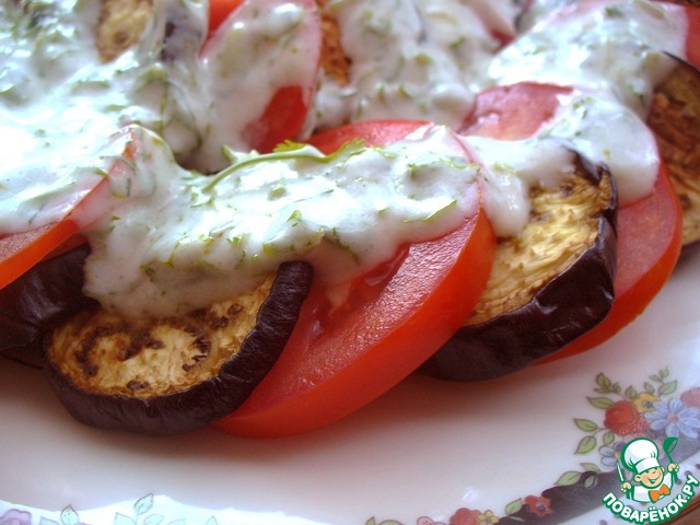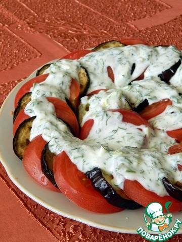 Выложить на дно тарелки маринованный лук (жидкость предварительно слить, а специи удалить). Сверху - запечённые баклажаны с помидорами. Полить йогуртовой заправкой.