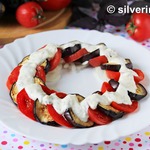 Баклажаны нарезать колечками толщиной 0,7-1 см. Выложить на бумагу для выпечки, смазать с помощью кисточки растительным/оливковым маслом и слегка посолить. Выпекать в разогретой духовке 20 минут.