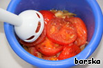 Выложить поджареные помидоры, лук, чеснок в комбайн или в высокую чашу.