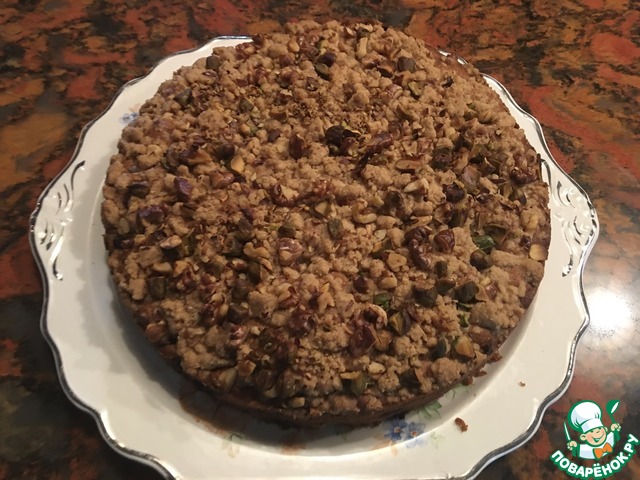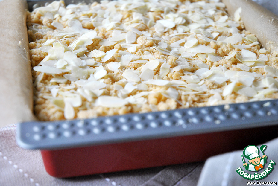 Тесто вылить в смазанную маслом (или выстеленную пекарской бумагой) форму (приблизительно 20х20 см). Посыпать штрейзелем и миндалем и выпекать в разогретой до 180 Ц духовке около 45-50 минут.