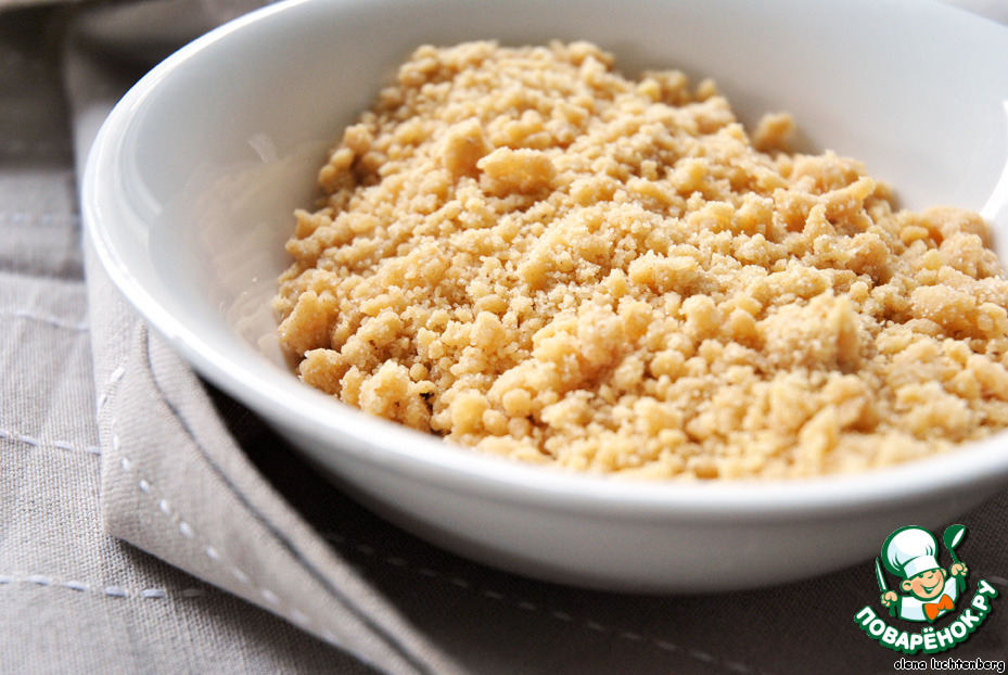 Для штрейзеля нарезать кубиками очень холодное масло (50 г) и перетереть кончиками пальцев в крошку с сахаром (50 г), мукой (70 г) и корицей. Поставить в холодильник.