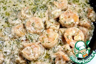 "Поставьте соус на огонь на 3-4 минуты, чтобы он загустел и полейте им креветок."