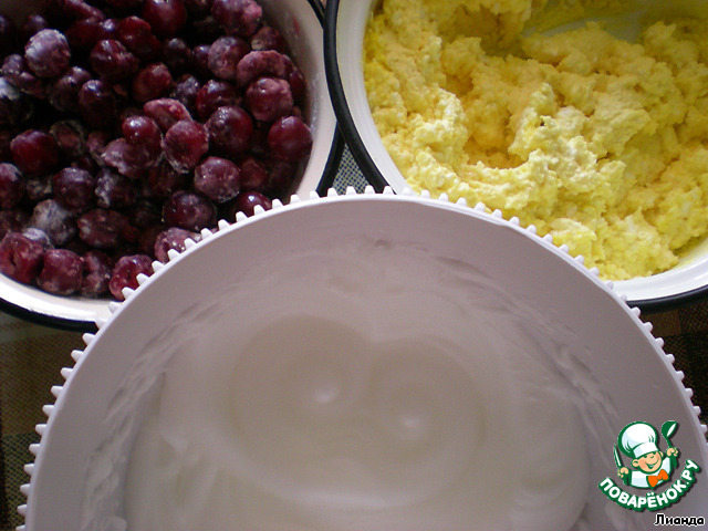 Творог смешать с желтками, сахаром, разрыхлителем. Лучше использовать для этого блендер.
