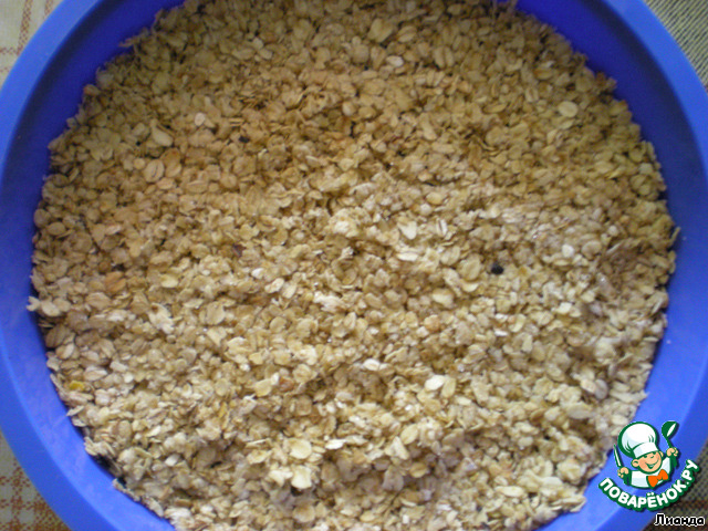 По дну формы распределить овсяные хлопья. Они получаются слегка рассыпчатые, пусть это вас не беспокоит. При выпечке из творожной массы выделится достаточно влаги.