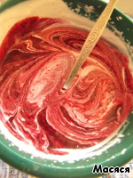 В первую половину добавляем ягодную массу и растопленный белый шоколад к сметане с творогом. Вот такой красивый цвет.