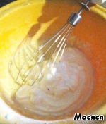 Добавляем к желткам муку, разрыхлитель. Перемешиваем. Затем аккуратно сверху вниз вмешиваем белки. Выливаем в смазанную маслом форму и отправляем в разогретую духовку на 30 минут.