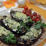 Баклажаны разрезать вдоль на 2 половинки, выбрать ложкой мякоть. Но не выбрасывать её, пригодится. Посолить половинки, оставить минут на 20. Потом промыть и обсушить. Укладываем на противень, ставим в духовку на 20 минут. -