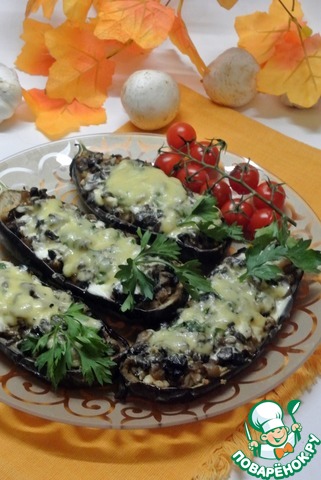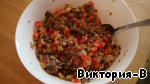 Смешиваем готовые грибы, фарш, мякоть баклажана, помидоры, чеснок, соль, перец.