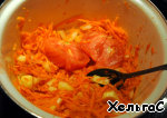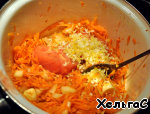 Мелко режем или протираем морковь, лук и чеснок режем и добавляем в кастрюлю. Помидор, уже очищенный от кожуры, идет туда же. Ошпариваем помидор, и кожа отходит очень легко. А сначала на дно кастрюли наливаем масло.