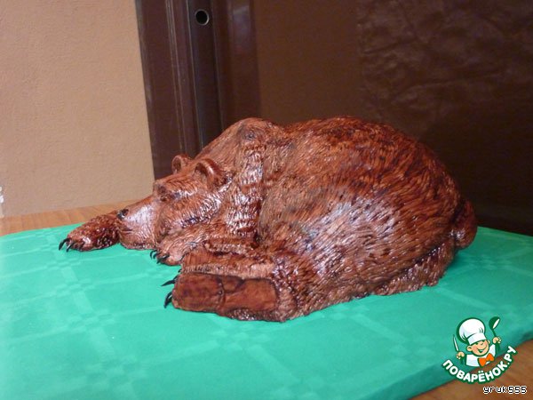 Краска. Какао-порошок развести водкой, спиртом или ромом (чем выше градус, тем быстрее испарится жидкость и высохнет торт). Плоской кисточкой с жестким ворсом покрасить медведя в коричневый цвет. Ногти и нос для блеска покрыть жидким медом (если не жидкий - развести в водке). Извлечь пленку, защищающую подставку. Торт готов!