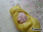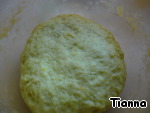 Отщипывая от теста небольшие кусочки, раскатать их в лепешки (или размять руками, это легко делается), положить немного начинки.