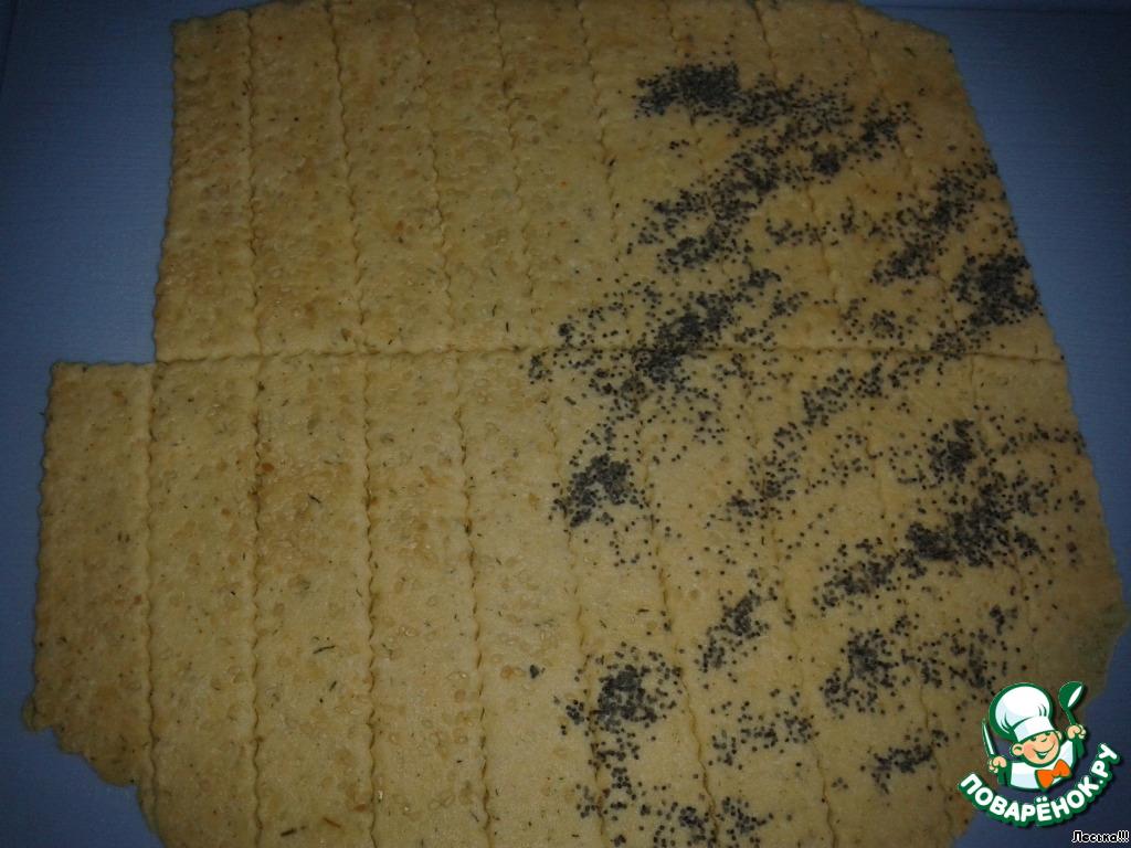 Посыпать кунжутом или маком. Я посыпала и тем и тем. Прокатать скалкой. Нарезать на полосочки.