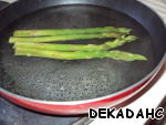 В глубокую сковороду налить воды и довести до кипения. Посолить и выложить спаржу. Сковороду чуток отодвинуть на край конфорки, чтобы варились только стебли, а не кончики. Варим 10 минут.