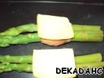 На противень выложить спаржу, предварительно завернув в пластину рыбы.