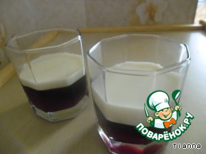 • Когда желатин набухнет, каждую из трех жидкостей нагреть до полного растворения желатина (не кипятить). Добавить сахарную пудру в сливки, к тому же, добавить немного ванилина. Наливать слоями в креманки или бокалы. Сначала сок.