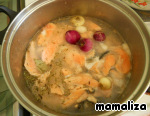 Припустить лосося в рыбном бульоне из воды и вина, с добавлением лаврового листа, тимьяна, лука и гвоздики, в течение 20 минут.