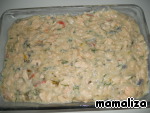 Соус перемешать с рыбой. Яйца взбить и добавить в рыбную смесь. Форму для запекания смазать маслом. Смесь выложить в форму.