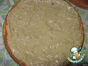 Бисквитный корж смазываем кремом из халвы, на него кладем корж с белками, смазываем кремом, затем - обычный корж, крем, еще один корж.