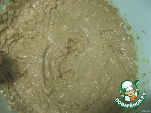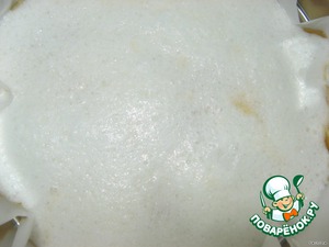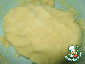 Желтки отделить от белков, взбить с половиной нормы сахара, добавить муку, размягченное масло, разрыхлитель, отдельно взбитые белки с другой половиной сахара. -