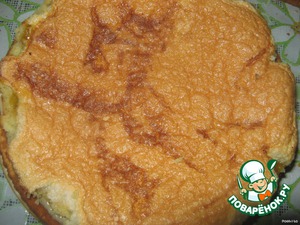 Берем один готовый бисквитный корж, пропитываем его абрикосовым джемом, заливаем взбитыми белками с кокосовой стружкой и ставим в духовку на 5-8 минут.