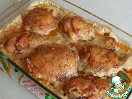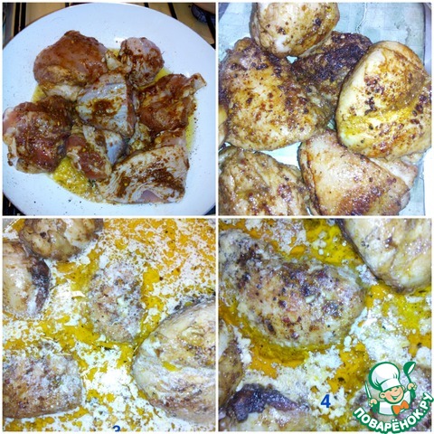 Обжариваем в масле куриные части по несколько минут с каждой стороны, до золотистой корочки, и выкладываем их в жаропрочную посуду (у меня стеклянная).