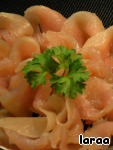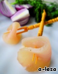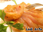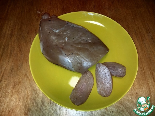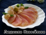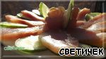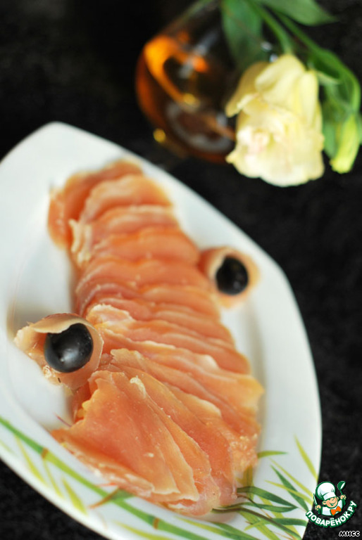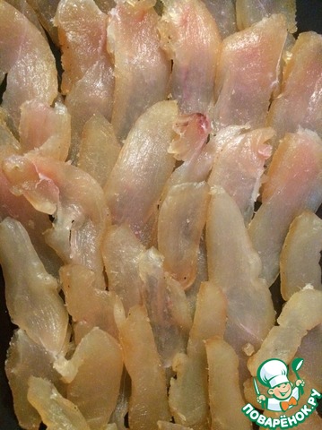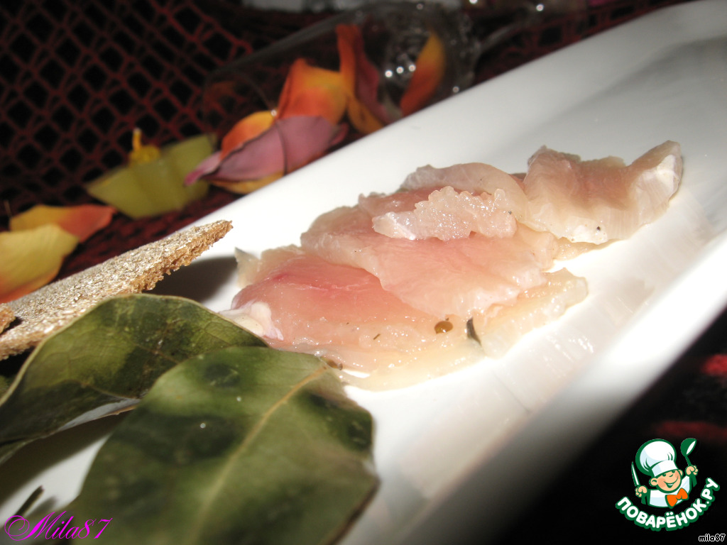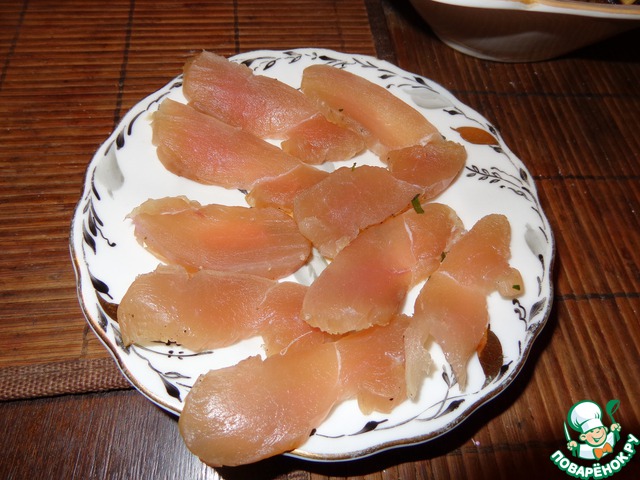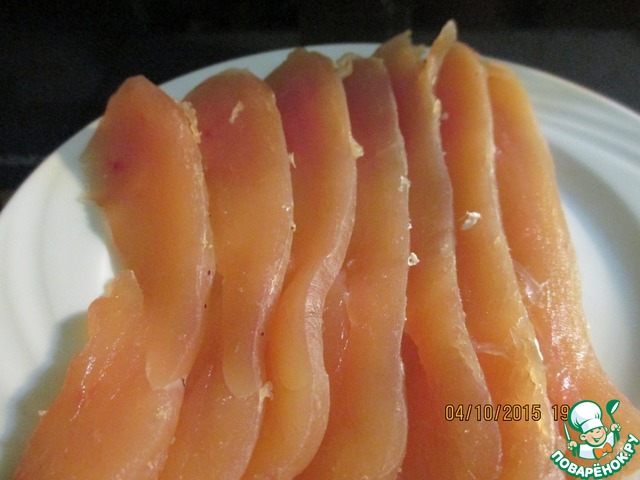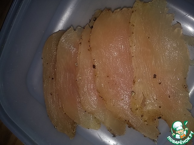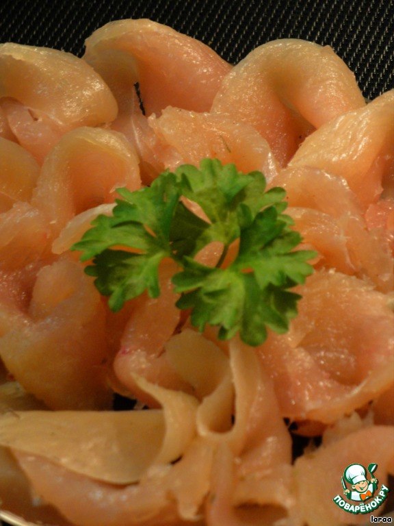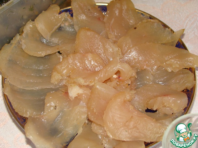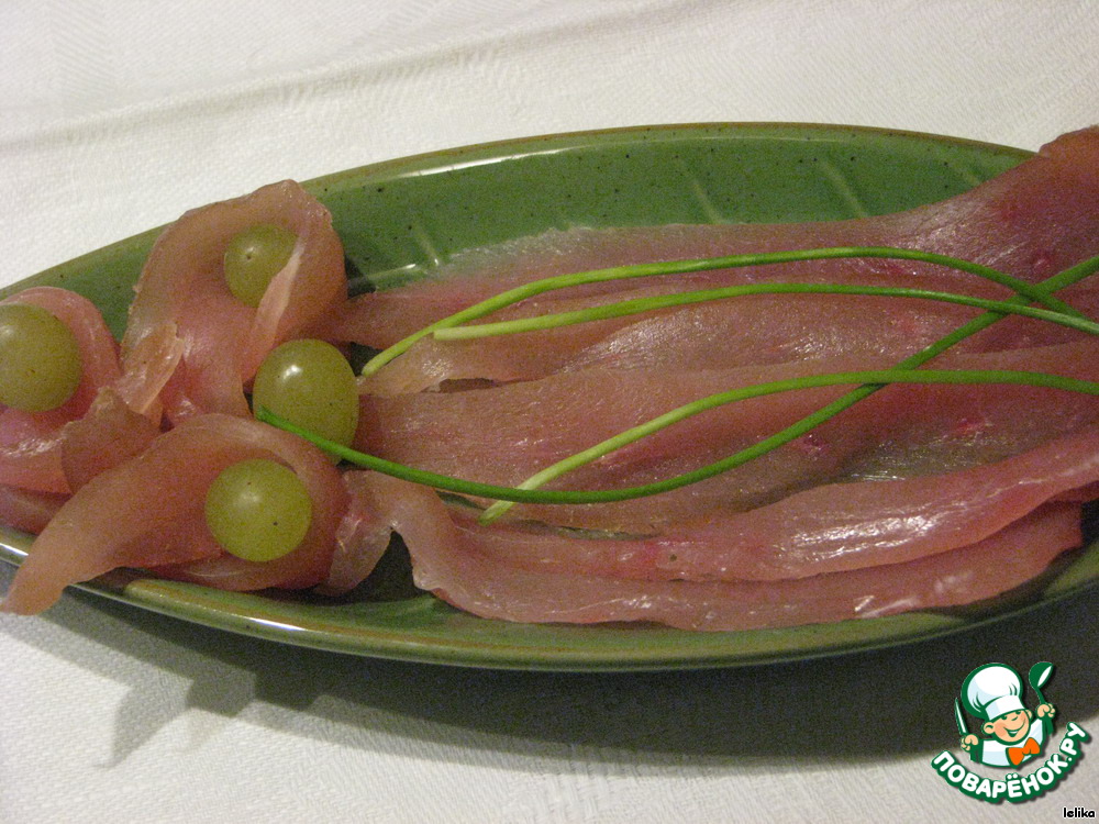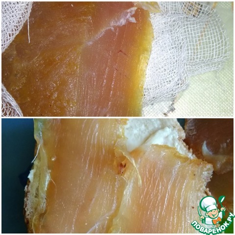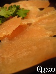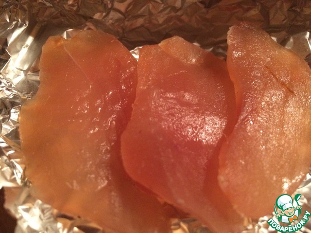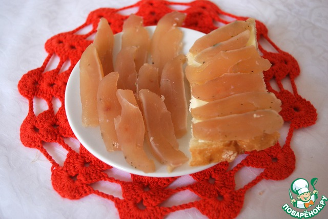 Пробовала такой балычок в гостях (пробую уже не первый год). Мне всегда очень он нравился. Взяла рецепт (наконец-то) и решила приготовить себе. Немного, правда, внесла изменения в количество ингредиентов. После приготовления одна готовая филешка улетела сразу за обедом. Если не сказать из чего сделано, то сразу можно подумать, что это кусочки соленой рыбки.