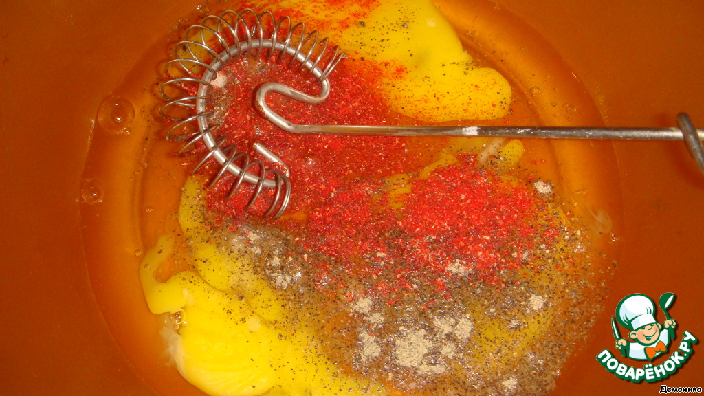 Яйца взбить с солью и приправами: я добавила перец и приправу для барбекю. Думаю, сухой зелёный лук тоже был бы тут не лишним, но закончился)