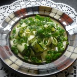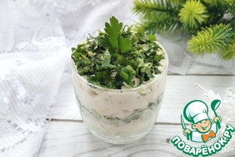 Приготовим заправку. Для этого петрушку и укроп нужно нарезать и растереть с солью. Влить туда уксус и масло. Поперчить, добавить сливки и перемешать.