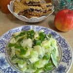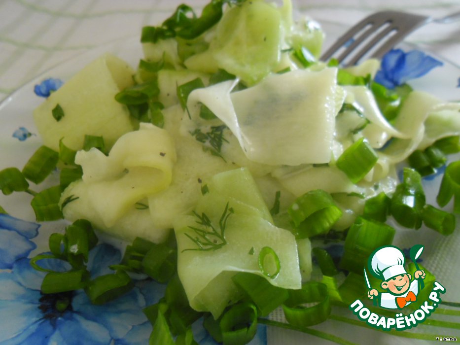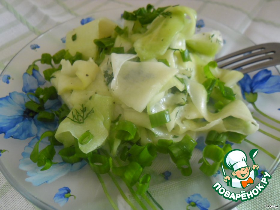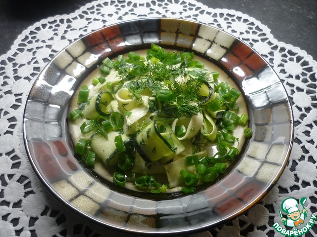 Огурцы и цуккини очистить и удалить плодоножки. С помощью овощечистки тоненько нарезать. Немного присолить и оставить на пару минут.