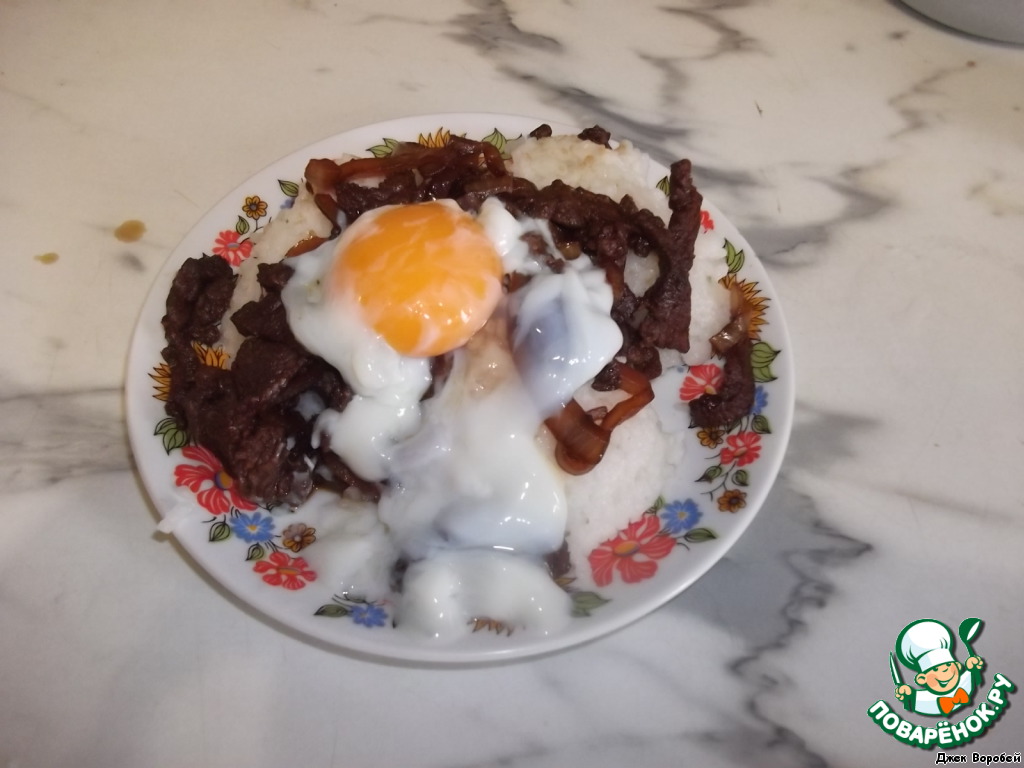 3. В разогретую скорвороду выливаю получившееся, как заскворчит - кладу мясо и интенсивно перемешиваю, через 1-2 минуты кладу нарезаный дольками лук, через 1-2 минуты мясная часть готова. Кладем на рис, можно добавить пару щепоток жареного кунжута сверху. Выливаем сверху яйцо. Можно есть!