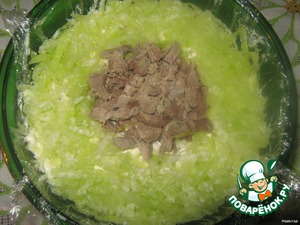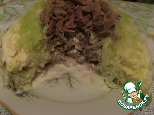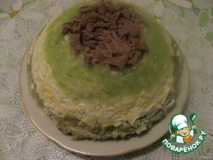Выкладывать слоями так, чтоб посередине было мясо, промазывая майонезом.
