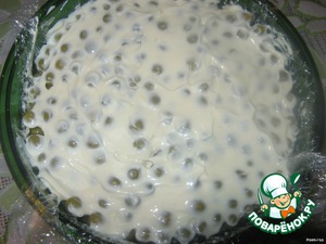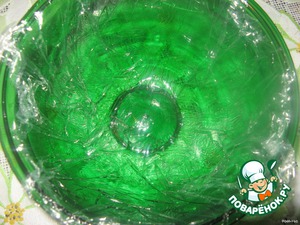 Глубокий салатник смазать растительным маслом, застелить пищевой пленкой.