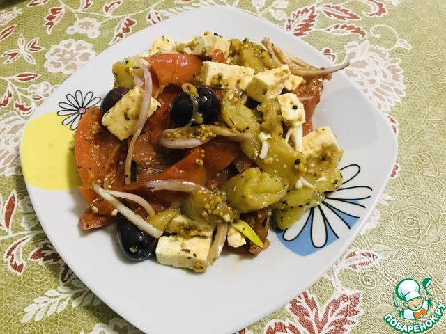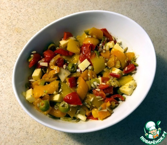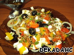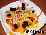 Перец режем соломкой, добавляем маслины, лук, соль, перец, фетаксу.
