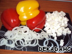Перец разрезать пополам, промыть, очистить от семян. Лук порезать кольцами, фетаксу - кубиками.