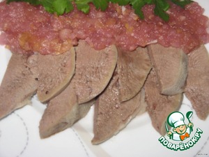 Язык нарезать ломтиками, выложить на тарелку, сверху положить соус.