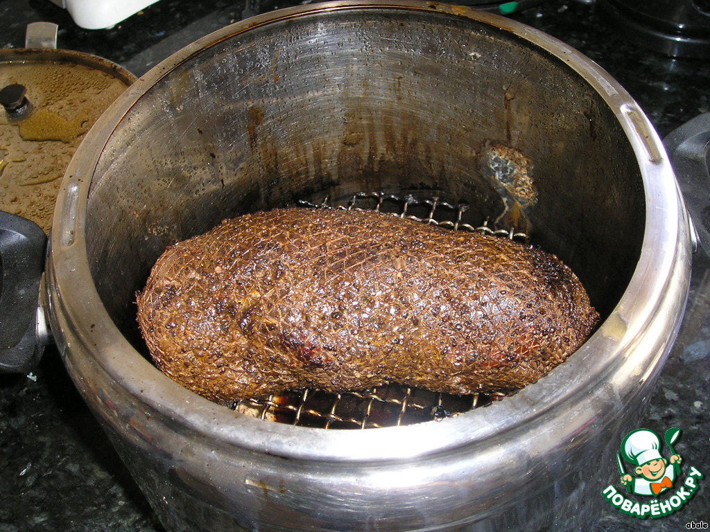 Снял с мяса сеточку. Завернул в пергамент. Уложил в целлофановый кулек и отправил на несколько часов в холодильник.