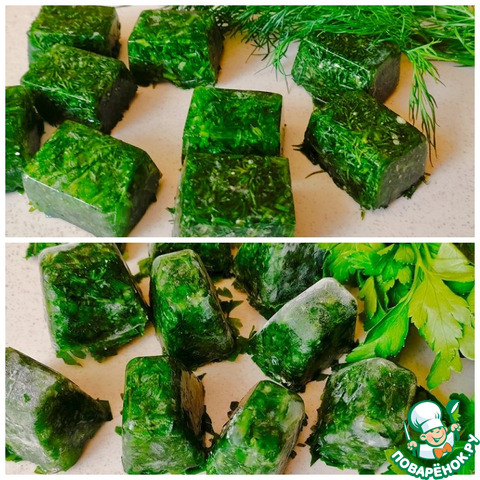 Порционные кусочки любимой зелени. Заготовка на зиму. Очень удобно кидать такие порции зелени, например, в суп, при варке картофеля и пельменей. Удобно хранить. Правда, не всегда есть место в морозилке :)