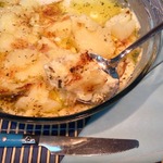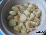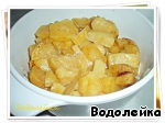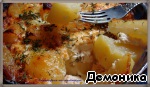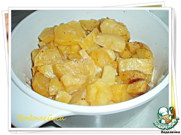Далее необходимо очистить картофель, но у моего шкурка настолько тонкая, что я не стала его чистить. Кроме того, у меня сорт Андретта, он сильно разварился, но вкусовые качества от этого не пострадали. Картофель разрезаем на дольки, у меня мелкий, поэтому разрезала пополам. Половину картофеля выкладываем в удобную форму, лучше глиняную или керамическую, смазанную сливочным маслом.