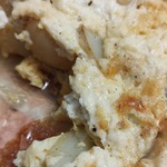 Творог тщательно растираем, добавляем кусочки сливочного масла. У меня сильно жирный домашний творог, поэтому масло добавлять не стала. Выкладываем творог сверху картофеля.
