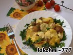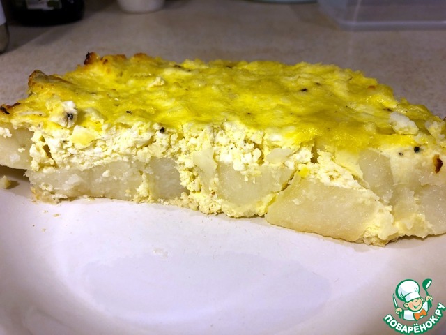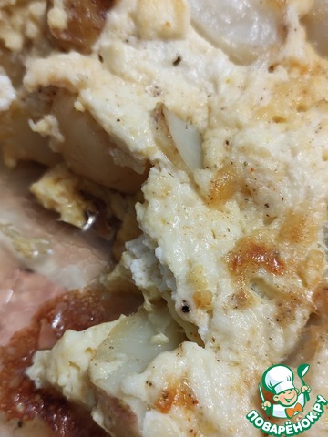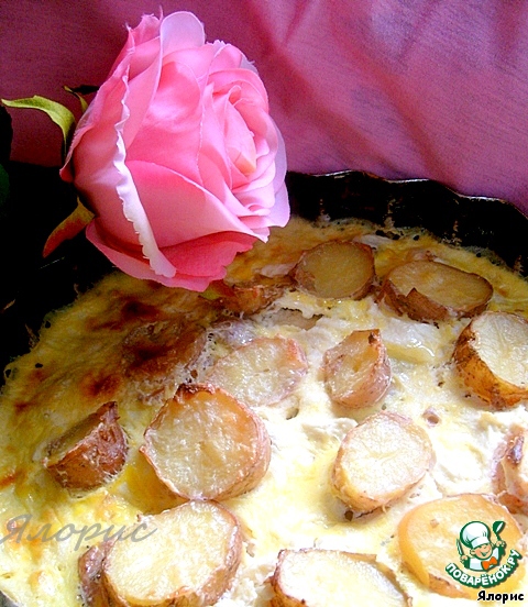 Заливаем этой смесью картофель. Ставим в разогретую до 200 градусов духовку на 40 минут. Пока не запечётся омлет и не зарумянится картофель.