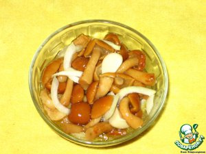 Остужаем. Можно вынести на холод, но не в морозилку! Добавляем порезанную полукольцами луковку, даeм ей чуть-чуть постоять с грибочками.