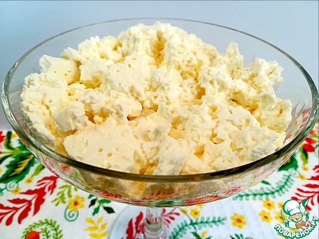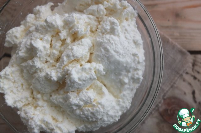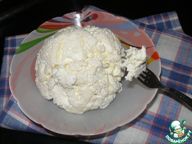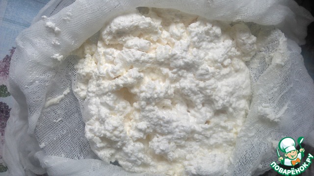 Откидываем творог на марлю. Сыворотку не выливайте. Ее можно использовать для приготовления дрожжевого теста. Оно получается очень нежное и легкое на сыворотке.