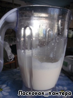 Пока желатин стынет, взбиваем миксером (или блендером) 250г сметаны и 150г сахара. Медленно вводим туда желатин и хорошенько перемешиваем.