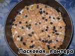 Смешиваем сметану с печеньем "Хрустик" с маком, абрикосами, нарезанными кубиками и черникой. Немного ягод черники оставить для украшения верха торта. Все это высыпаем в форму для торта и равномерно распределяем. Ставим на минут 10 в холодильник.