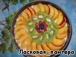 Выкладываем на торт нектарин, киви, малину и чернику.